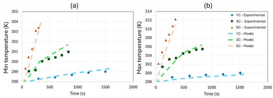 The battery temperature distribution was assessed by comparing the minimum and maximum temperatures obtained from the present numerical model with those reported in Kim et al. [19]. Figure 3a,b illustrate the evolution of the minimum and maximum battery temperatures over time for different discharge rates (1C, 3C, and 5C). The experimental results from Kim et al. [19] provide a reference for evaluating the accuracy of the proposed model. The simulated temperatures closely follow the experimental trends, demonstrating a strong correlation across all charge/discharge rates. The discrepancy between the model and experimental temperatures remains minimal, indicating the effectiveness of the adopted thermal model in capturing the heat generation and dissipation dynamics within the battery system.