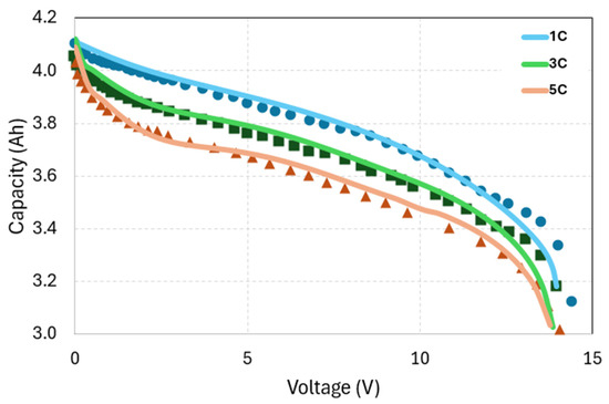 Figure 5 presents a comparison between the modeled voltage-capacity discharge curves and the experimental results from Kim et al. [35], demonstrating a strong agreement across different discharge rates. The predicted voltage profiles at 1C, 3C, and 5C closely follow the experimental data, confirming the model’s ability to capture the electrochemical behavior of the battery accurately. This agreement confirms the accuracy of both the electrochemical and thermal aspects of the model, as battery voltage is influenced by both factors. The model successfully reproduces the characteristic voltage drop as the discharge rate increases, a phenomenon attributed to increased polarization and ohmic resistance at higher currents. Furthermore, the model effectively replicates the expected voltage drop as the discharge rate increases, a trend that aligns well with experimental observations. This consistency highlights the model’s reliability in predicting the voltage response of LIBs under varying discharge conditions.