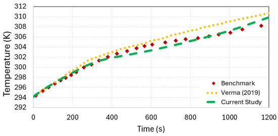 After validating the battery model, the performance of the integrated PCM thermal management system has been assessed by comparing simulation results with the benchmark data from Javani et al. [20], which investigated heat transfer and thermal management of lithium-ion cells using PCMs. Additionally, the results were assessed against the numerical results of Verma et al. [21] to further establish the reliability of the model.