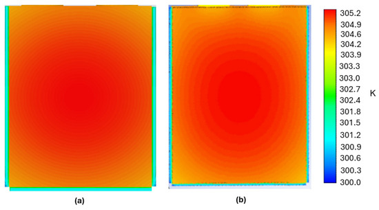 The temperature distribution contours for the lithium-ion battery at a 5C discharge rate after 11 min of operation are presented in Figure 2, which shows the experimental IR thermal image (a), the numerical prediction from Kim et al. [34] model (b), and the results from the present study (c). The temperature scale ranges from 298 K to 318 K, as indicated by the color bar. The experimental thermal image displays localized temperature variations, with higher temperatures concentrated in the central region of the battery cell. The model prediction from Kim et al. [34] (b) captures the general temperature distribution pattern with more uniform isotherms. The results from the present study demonstrate excellent agreement with both the experimental data and Kim et al. [35], accurately reproducing the temperature gradients and spatial distribution patterns. The slightly cooler areas near the terminals are correctly captured, as is the temperature rise in the central region. This spatial temperature distribution comparison serves as a critical validation step, confirming that the present model correctly reproduces not only the maximum and minimum temperatures but also their spatial distribution across the battery cell at high discharge rates.
