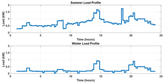 In this study, the consumption activity of different appliances of non-deferable loads in a typical single-family house is illustrated in Table 1. Figure 2 shows the electrical load profiles for this house on typical summer and winter days, considering only the non-deferable loads. The consumption profiles for various appliances were derived from real datasets utilized in the referenced study [31], ensuring the incorporation of realistic and accurate energy usage patterns.