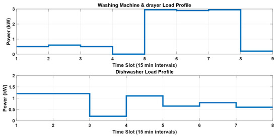 DW and WM are classified as deferable loads, with their load profiles influenced by technical specifications and operating modes. As a result, each household exhibits distinct patterns for the power consumption profile of these appliances. In this study, the load profiles of these devices are derived from a real measurement dataset [31]. As shown in Figure 3, the DW profile has three sub-cycles: wash, rinse, and dry. A complete cycle takes roughly 105 min, and the power consumption varies from 1.2 kW to 0.6 kW. For a WM and dryer, as shown in Figure 3, the WM operates for about 45 min, comprising three sub cycles: wash, rinse, and spin, with power consumption ranging from 0.52 kW to 0.65 kW. After a 15 min delay, the dryer initiates operation and continues for one hour, with power consumption varying between 2.97 kW and 0.19 kW. The proposed strategy aims to find the optimal schedules of those deferable appliances to reshape the overall power consumption profile in such a way that minimizes the degradation process of system components as much as possible.