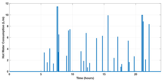 where (°F) is the inlet water temperature, (°F) is the room temperature, (gallons/m) is the hot water demand flow rate, ( is the tank surface area, (gallons) is the tank volume, (°F. is the tank heat resistance, and (m) is the time slot duration. The technical specifications of the water heater are given in Table 3. The operation of the water heater depends on the hot water demand (HWD) consumption profile for the specific household. The current study used the methodology described in [34] as a baseline to establish the HWD consumption profile. This approach measures the HWD consumption patterns and applies a stochastic strategy to generate 1 min profiles of HWD. The probability of both flow rate and time of occurrence depends on the hot water consumption category, as presented in Table 4. Figure 4 shows the 1 min HWD consumption profile in (L/m) at 45 °C for an example day in the winter for a single-family house. The hot water in the tank is mixed with the incoming mains water to achieve the required HWD temperature of 45 °C. The hot water demand from the water tank, measured in (gallons/m), can be calculated using the following equation: