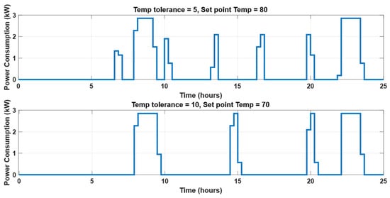 where (gallons/m) is the flow rate at 45 obtained by multiplying the flow rate in Figure 4 by a factor of 0.26417. () and () are the inlet temperature and tank temperature, respectively. The effect of temperature tolerance and setpoint temperature on the power consumption profile of WH is shown in Figure 5. Therefore, controlling these parameters for WH can contribute to SDSM by reshaping the consumption profile in such a way that reduces degradation cost as much as possible.