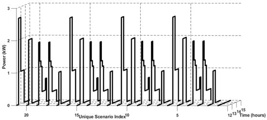 In general, the uncertainty of the consumption power profile for cooking comes from different factors, including starting time of preparation, dish type, dish amount, cooking time, and cooking behavior. There are fewer examples in literature for modeling of consumption power profile for cooking, such as the study in [35], where the authors propose a novel strategy to model high-resolution cooking power consumption using the LoadProGen algorithm, which functions as an outer stage. The timing of each cooking cycle and its corresponding power consumption can be adjusted to account for uncertainty. The proposed strategy uses the technique that is described in [35] as a baseline to generate the cooking consumption profiles. There are usually some familiar dishes for each meal in a distinct house, and the cooking habits, such as the starting preparation time and the cooking intervals, tend to fall within a specific range. The main meals in Egypt derived from direct field observations are divided as follows: breakfast typically consists of ful medames, taameya (falafel), bread with cheese or eggs, and tea or milk. Lunch includes some main dishes such as rice, meat or chicken, remaining food, vegetables, chicken pane, traditional dishes, and molokhia. Dinner usually features popular dishes, cheese, vegetables, and fruits, accompanied by tea or coffee. This study aims to model the power consumption profile for cooking lunch only because the stove will feed directly from the HHO electrolyzer during lunch preparation during the summer session, but the preparation of other meals uses H2 gas stored in the tank due to insufficient irradiation so that it does not require to obtain their consumption profile. Table 5 illustrates the power ranges, average preparation time, and the range of starting times for preparing different lunch meals. Moreover, the HHO stove, with a total efficiency of 60%, is assumed to have three burners having the power ranges: low-power (LP) (500–1000 W), medium-power (MP) (1100–1500 W), and high-power (HP) (1600–2000 W) [35]. The average starting time of lunch preparation is represented by five instants starting from 01:00 PM to 02:00 PM with 15 min time slots. So, there are 35 scenarios for lunch consumption power profiles with equal probabilities. Similar consumption profiles are merged and represented by one profile with their summing probabilities to reduce the number of scenarios. Figure 6 shows the decreasing scenarios for power consumption of the HHO electrolyzer that feeds the stove during lunch cooking according to the data in Table 5.