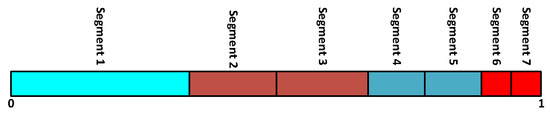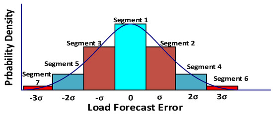 Firstly, the PDF function is divided into seven segments; each segment has a wide equal to the standard deviation error (σ). Moreover, each segment has its probability denoted by . Roulette wheel mechanism (RWM) generates the scenarios at each time slot [37]. In this regard, the accumulative normalized probabilities are obtained for all segments, as shown in Figure 8. Then, a random number is generated between 0 and 1 for each time slot that follows a Sobol sequence. The first segment with an accumulated normalized probability less than or equal to this random number is selected. The load forecast error and the probability of this selected segment are used for this time slot. This process continues until the required number of scenarios is obtained. Moreover, the probability of each scenario can be determined as follows: