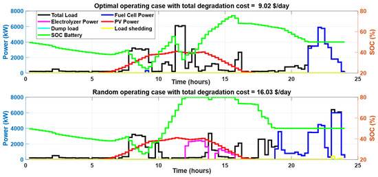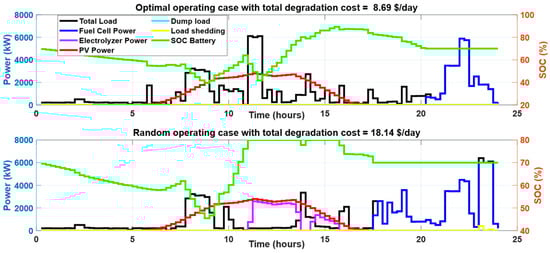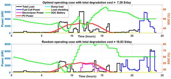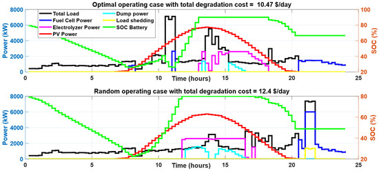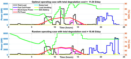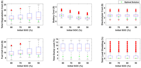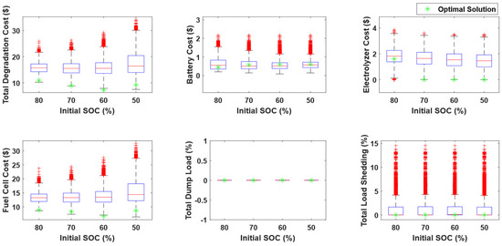 During summer days, the appliances that contribute to SDSM are WMs and DWs. Table 9 summarizes the SDSM results for the day considered at different initial battery SOCs. The proposed SDSM ensures zero load shedding and limits the dumping loads to be lower than 4% at different initial SOCs. Figure 16 compares the power consumption profiles of different components during both the optimal case and random operating cases at an initial SOC of 50%. The optimal operating times of shiftable loads resulted in lower utilization of fuel cells and the PEM electrolyzer in addition to the minimization of dump load and zero load shedding. Therefore, the total degradation cost was decreased to 9.68 USD/day in the optimal case compared with a degradation cost of 17.43 USD/day in the considered random operation sample. The effect of initial SOC on the minimum degradation cost is illustrated in Figure 17, Figure 18 and Figure 19, where 50% initial SOC resulted in the lowest degradation cost due to the minimization of the fuel cell and PEM electrolyzer operation. To compare the optimal operation condition with random operation scenarios, the boxplots in Figure 20 summarize these results, which show a substantial impact of the proposed strategy on reducing the total degradation cost and ensuring the required constraints across different initial battery SOCs. Furthermore, the proposed SDSM resulted in a reduction in the total degradation cost, compared with the median of 10,000 random scenarios, equal to 12.6%, 8.66%, 19.5%, and 25.87% initial battery SOCs equal to 80%, 70%, 60%, and 50%, respectively.