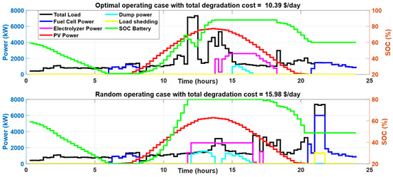 The power profile of different components during optimal operation and random operation cases at initial SOC = 80% on a typical summer day.