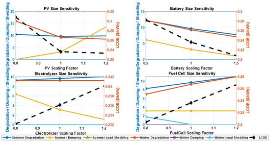 The sensitivity analysis, illustrated in Figure 21, evaluated the impact of variations in key system parameters, including PV size, battery capacity, electrolyzer capacity, and fuel cell size, on critical performance metrics such as degradation costs, energy dumping, load shedding, and LCOE. This analysis will account for structural performance analysis for different sizing factors for each component, conducted in both summer and winter scenarios. For the responses from the scenarios, analyzing the size sensitivity of the PV showed that as the size increased from 0.8 to 1.2, the overall performance of the system in winter improved with less load shed and degradation. Increasing the PV size to 120% led to an energy dump, particularly in summer. The scenario of a PV size with a scaling factor of 1.2 increased the energy dumped in the summer period to 13.5%. As the PV size increased, the degradation cost decreased. This was because the increased size reduced the reliance on fuel cells in winter, causing less degradation. However, there was no effect of PV size on the degradation cost in the summer; therefore, there was no significant decrease. The LCOE reached 0.31 USD/kWh at a sizing factor of 0.8, which mostly reflected the high degradation of the fuel cells in winter when there is low PV generation and high reliance on the fuel cells. The low PV generation in winter increases the operational load on the fuel cells. It leads to high degradation costs, contributing to increases in overall LCOE at low PV capacity.