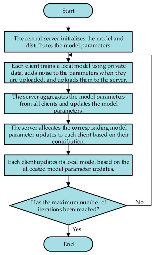 Additionally, data privacy issues have become a key factor hindering the development of the electricity business environment. As electricity data continues its explosive surge, the issue of “data silos” is becoming increasingly grave. Federated learning technology effectively solves the “data silo” problem [9,10]. It empowers participants to co-develop models while preserving data residency within their native domains. Although federated learning protects privacy by sharing model parameters rather than the original data, it is still possible to infer sensitive information through model parameters [11,12]. Consequently, implementing privacy-preserving mechanisms becomes imperative to rigorously safeguard client data confidentiality throughout the data processing pipeline.