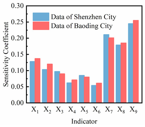 After adding disturbances to the original feature values of the nine indicators in the electricity business environment evaluation system, the sensitivity coefficients of each indicator are shown in Figure 7. Among the two sets of data, the sensitivity coefficient of indicator X9 is the highest, indicating that this indicator has the greatest impact on the total score of e-commerce environment indicators. The second and third sensitive indicators are X7 and X8, respectively, which have a relatively significant impact on the total score of the e-commerce environment indicators. The sensitivity coefficients of the remaining indicators were all lower than those of indicators X7, X8, and X9, indicating that the influence degree of the remaining indicators on the total score of the e-commerce environment indicators was less than that of indicators X7, X8, and X9.