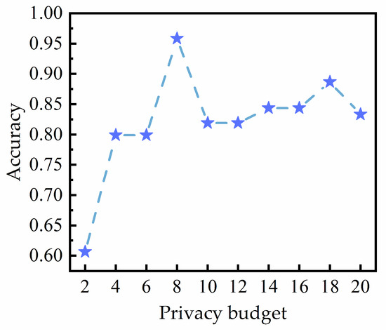 To evaluate the proposed approach’s privacy-related effectiveness, model accuracy across diverse privacy budgets was contrasted. Experimental outcomes are illustrated in Figure 8. From Figure 8, the accuracy of the method is seen to fluctuate with rising privacy budgets. Specifically, maximum accuracy (95.83%) is attained when the privacy budget is configured to ε = 8. To ensure the model sustains high accuracy alongside effective privacy protection, ε is designated as 8 in subsequent case analyses.
