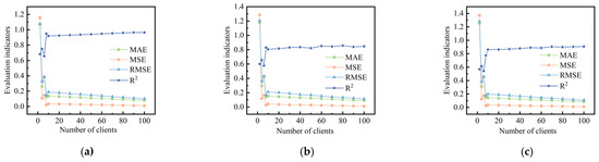 Figure 10c,d show the comparison diagram of the four indicators (MAE, MSE, RMSE, R2) and the calculation time of the MLP model under the three algorithm frameworks of Fedavg, the federated normalized average algorithm (Fedprox), and the federated normalized average algorithm (Fednova) when 10 clients are used, and the specific results are shown in Table 8. The experimental results show that the four evaluation indicators of the Fedavg algorithm are not as good as those of the Fedprox and Fednova algorithms, because the proximal term is introduced into the Fedprox algorithm to adjust the local update, so that the training of each client is closer to the global model, reducing the difference of model update and improving the accuracy of the model. By reasonably adjusting the gradient contribution of different clients, the Fednova algorithm can better learn the data characteristics, reduce the error, and improve the fitting effect. However, the computation time required by the Fedavg algorithm is shorter than that of the Fedprox and Fednova algorithms, because the Fedprox algorithm adds proximal term calculation in local training, which increases the local computational complexity. The process of calculating the normalization factor in the Fednova algorithm is relatively complex, which increases the computational cost.