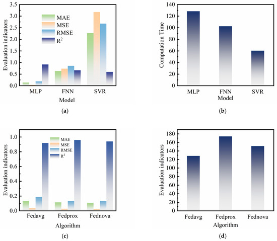 Comparison of four evaluation indicators and computation time under different models and different algorithms: (a) comparison of four evaluation indicators of different models under the Fedavg algorithm framework; (b) comparison of the computing time of different models under the Fedavg algorithm framework; (c) comparison of four evaluation indicators in the MLP model under different algorithms; (d) comparison of the calculation time of MLP models under different algorithms.