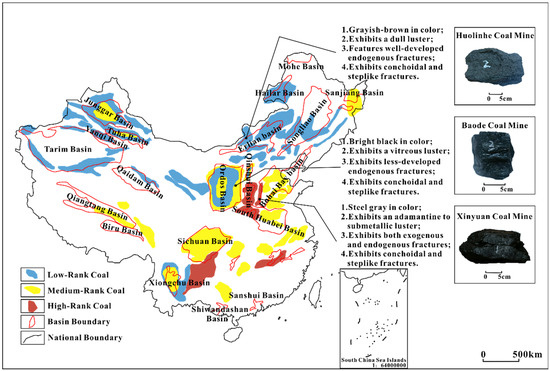 The coal samples analyzed in this study were collected from three mining sites: Baode Mine, Xinyuan Mine, and Huolinhe Mine (Figure 1). Among them, Huolinhe Mine represents low-rank coal, Baode Mine medium-rank coal, and Xinyuan Mine high-rank coal. The significant differences in metamorphic degree among these coal ranks lead to obvious variations in the development characteristics of their natural fractures. Table 1 presents the ash yield and organic maceral compositions of coal samples from three mining areas. Through proximate analysis of coal, the ash yield on an air-dried basis (Aad) is used to approximately characterize the mineral content, among which Xinyuan Mine shows the highest ash yield, indicating the highest mineral content. In Xinyuan and Baode mines, vitrinite dominates the macerals with inertinite as the secondary component. In contrast, Huolinhe samples are primarily composed of vitrinite, with inertinite constituting a minor proportion.
