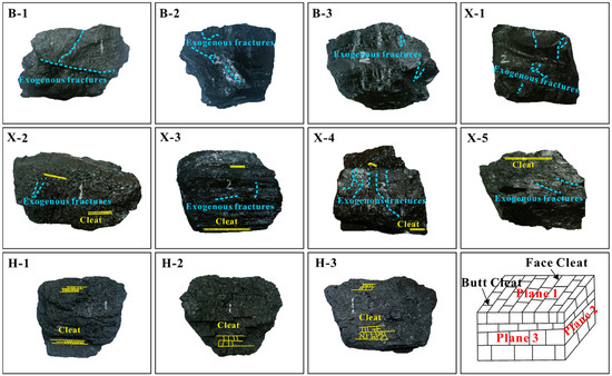 A total of 11 coal specimens were prepared, comprising 3 from Baode, 5 from Xinyuan, and 3 from Huolinhe. A letter-based coding system was established using the initials of each mine: B for Baode (labeled B-1 to B-3), X for Xinyuan (X-1 to X-5), and H for Huolinhe (H-1 to H-3). During sample preparation, coal blocks were cut into cuboids with six relatively flat surfaces, and three characteristic structural planes were defined: Plane 1 as the vertical plane perpendicular to bedding planes (stratigraphic orientation), Plane 2 as the strike-aligned plane with face cleats, and Plane 3 as the strike-aligned plane with butt cleats (Figure 2).