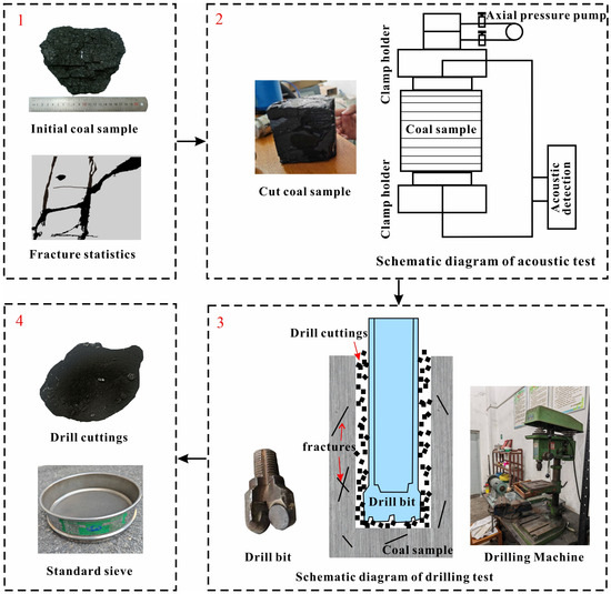 The study first conducted macroscopic description and analysis of coal rock fracture characteristics, statistically calculating fracture line density ρ1, geological strength index (GSI), and fracture area ratio ρ2 to achieve quantitative fracture characterization. Following fracture characterization, the cut cubic coal rocks underwent acoustic emission testing to record wave velocity data. Subsequently, drilling tests were performed on the coal rocks with relevant data recorded. Finally, quantitative analysis was conducted on drill cuttings generated during the drilling process (Figure 3).