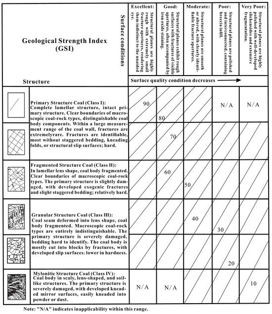 The Geological Strength Index, proposed by Hoek et al. [37], reflects rock integrity, surface roughness, and fracture development. The quantitative evaluation dimensions and corresponding features of GSI estimates can be visually presented through the grading system in Figure 4 [38,39].