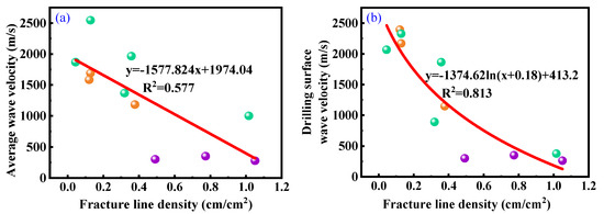 Relationship between fracture line density and acoustic parameters including (a) average wave velocity and (b) drilling surface wave velocity.