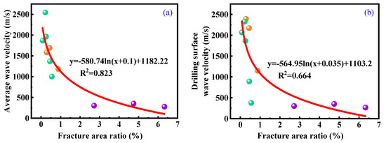 Relationship between fracture area ratio and acoustic parameters including (a) average wave velocity and (b) drilling surface wave velocity.