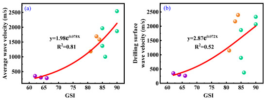 Relationship between GSI and acoustic parameters including (a) average wave velocity and (b) drilling surface wave velocity.