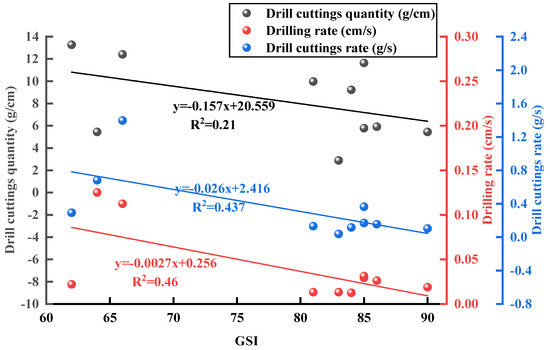 Figure 11 reflects the relationship between GSI and drilling parameters. According to the linear fitting curve, the fitting effect between GSI and Q, w, and q is weak (R2 between 0.21 and 0.46) but overall manifests a negative correlation, meaning that, as GSI increases, Q, w, and q show a decreasing trend. There is a negative correlation between GSI and drilling parameters, which may be due to the fact that the larger the GSI, the more stable the structure of the coal rock and the greater the resistance that the drill bit needs to overcome, resulting in a decrease in the amount of cuttings and drilling rate.