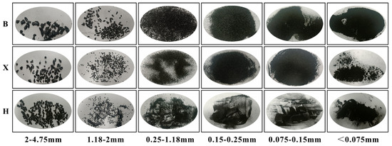 Particle size screening of cuttings from different types of coal samples (B: Baode coal samples, X: Xinyuan coal samples, H: Huolinhe coal samples).