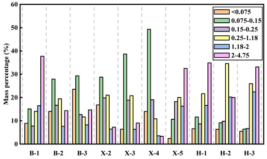 Figure 12 visually displays the particle size distribution of coal cuttings from three mining areas after sieve analysis, while Figure 13 presents histograms of cuttings size distributions for coals with distinct fracture characteristics post-drilling. Analysis reveals significant variations in the percentage of cuttings across different particle size ranges among samples. For instance, in the 2–4.75 mm size range, Sample B-1 accounts for 37.74%, whereas Sample X-4 constitutes only 3.31%. This disparity reflects regional differences in the abundance of coarse-grained cuttings generated during drilling-induced fragmentation, implying that the intrinsic properties of coal rock strongly influence cuttings size distribution. The observed variations may stem from differences in structural integrity, hardness, and fracture development intensity among coals from different mining areas, which govern particle size generation during mechanical breakage processes.