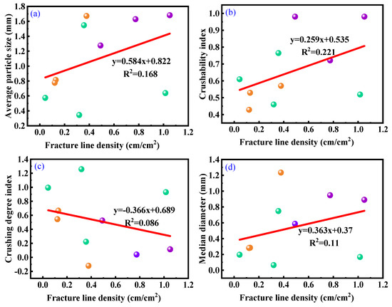Relationship between fracture line density and cuttings parameters including (a) average particle size, (b) crushability index, (c) crushing degree index, and (d) median diameter.