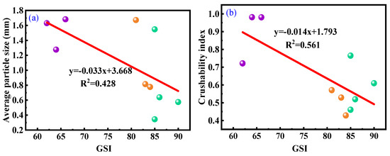 Relationship between GSI and cuttings parameters including (a) average particle size, (b) crushability index, (c) crushing degree index, and (d) median diameter.