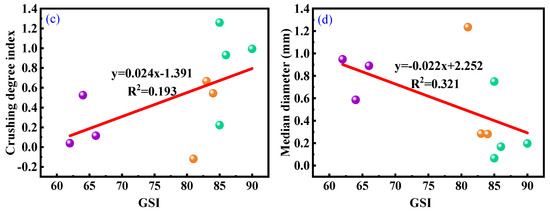 The fitting results between GSI and four drilling parameters (d, n, λ, d50) are shown in Figure 16. The fitting effect with n is moderate (R2 = 0.561, Figure 16b), whereas the fitting effects with d, λ, and d50 are weaker (Figure 16a,c,d). In particular, GSI exhibits a negative correlation with n, meaning that larger GSI values correspond to a more dispersed particle size distribution of cuttings after coal rock fragmentation. The fitting effect between GSI and d, λ, d50 is poor, indicating that the impact of GSI changes on d, λ, d50 is not as significant as on n.
