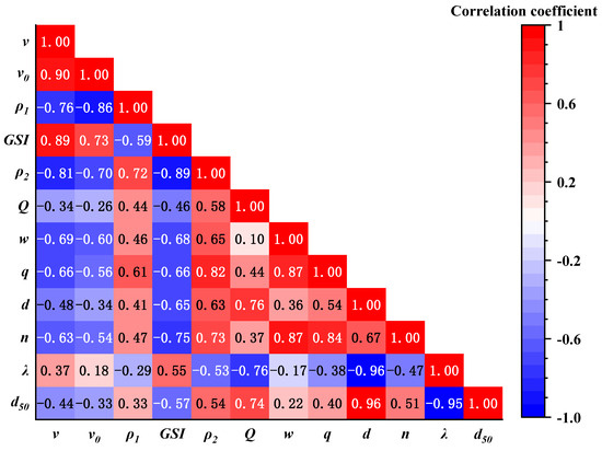 Using OriginPro 2021 data analysis software, Pearson correlation coefficient (r) analysis was conducted on the experimental data of acoustic parameters, drilling parameters, and cuttings characteristic parameters. This systematically quantified the linear correlations between variables. Specifically, |r| > 0.7 indicates a strong correlation, 0.5 < |r| ≤ 0.7 a moderate correlation, 0.3 < |r| ≤ 0.5 a weak correlation, and |r| ≤ 0.3 an extremely weak correlation. The correlations were visually presented by plotting a correlation heatmap (Figure 17). The correlation heatmap visually presents the correlation between variables in terms of color depth, with warm tones representing positive correlation and cool tones representing negative correlation. The darker the color, the stronger the correlation. The variables included in Figure 17 are acoustic parameters (average wave velocity v, drilling surface wave velocity v0), fracture parameters (fracture line density ρ1, Geological Strength Index GSI, fracture area ratio ρ2), drilling parameters (drill cuttings quantity Q, drilling rate w, drill cuttings rate q), and cuttings parameters (average particle size d, crushability index n, crushing degree index λ, median diameter d50).