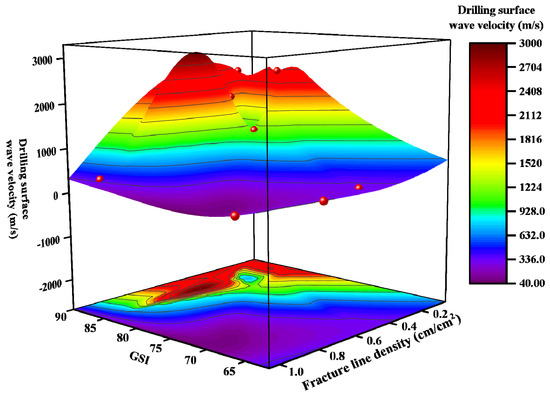 From the analysis in Section 3.1, it is evident that the propagation behavior of acoustic waves in coal rock is closely linked to the intensity of fracture development. Figure 18 displays a 3D correlation plot of drilling surface wave velocity v0, GSI, and fracture line density ρ1. The figure demonstrates that v0 increases with higher GSI values, whereas it decreases as ρ1 rises. This trend further validates the intrinsic connection between acoustic parameters and fracture development: more intact coal structures with lower fracture densities facilitate faster acoustic wave propagation. The underlying mechanism lies in fractures acting as discontinuous interfaces within the wave propagation path, inducing reflection, refraction, and scattering [42,43]. These phenomena elongate the effective propagation path, with higher fracture densities exacerbating path tortuosity and propagation distance, thereby significantly reducing wave velocities. Additionally, air-filled voids within fractures further diminish acoustic energy transmission efficiency [44]. Conversely, elevated GSI values signify enhanced structural integrity, resulting in more continuous propagation paths, reduced energy attenuation, and consequently higher wave velocities. Collectively, these findings confirm that acoustic parameters can serve as reliable indirect indicators for evaluating the intensity of coal fracture development.