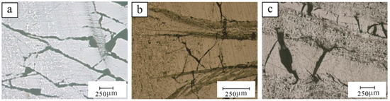 Microscopic images of microfractures in coal samples from the Xinyuan, Baode, and Huolinhe mining areas: (a) Xinyuan, (b) Baode, (c) Huolinhe.