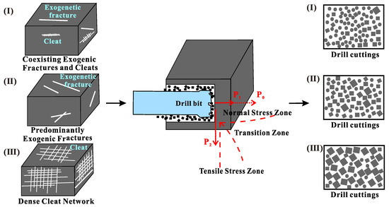 During coal rock drilling, the rotation and axial advancement of the drill bit exert a combined mechanical action on the coal rock ahead (Figure 20). Specifically, kinetic energy transfer during rotation forms normal stress P0 directly ahead of the coal rock, while cyclic air flow generates additional normal stress P1, with both stresses acting on the coal rock ahead. Additionally, shear stress P2 is applied to the borehole wall during drill tooth rolling, further influencing the stress state of the coal rock. In terms of stress distribution, normal stress dominated by axial pressure coexists with tensile stress from circumferential shear action ahead of the borehole [45]. A stress zone forms around the drill bit, consisting of a normal stress region and a tensile stress region, with a transition zone at their interface. The original structure of the coal mass remains in mechanical equilibrium when undisturbed, but drilling induces local stress redistribution. When stress concentration exceeds the compressive or tensile strength of the coal rock, the coal mass fractures [46], inevitably producing cuttings. Due to significant variations in coal rock fracture development, cuttings characteristics exhibit diverse features.