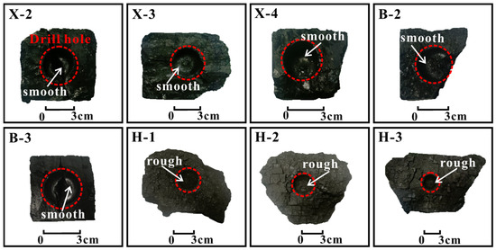 The drill hole characteristics (Figure 21) exhibit intrinsic correlations with coal rock fracture development. Type I coal rock (high GSI value) exhibits smooth and intact drill hole walls, indicating its homogeneous structural response. Type II coal rock, despite maintaining its structural integrity, exhibits directional cracking along randomly distributed exogenous fractures, manifested as smooth wall surfaces with localized fragmented zones. Type III coal rock (low GSI value) displays significantly roughened and fragmented drill hole walls due to dense-cleat-network-induced structural loosening. This morphological differentiation essentially reflects the macroscopic manifestation of coal rock fracture heterogeneity in mechanical response.