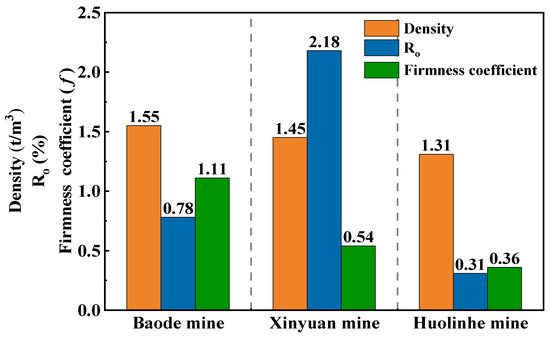 Comparison chart of coal rocks’ density, Ro, and f from Baode, Xinyuan, and Huolinhe Mines.