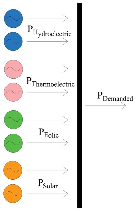 The objective of EDHGS is to cover the required demand at the lowest possible cost, prioritizing renewable energy generation due to its negligible operational costs [20]. In this study, scenarios are simulated where hydroelectric production is restricted to observe its impact on economic value, as thermoelectric plants, with their higher operational costs, would compensate for lower hydroelectric production, as is shown in [21]. For this case study, there are photovoltaic solar plants and wind farms that help cover the demand to minimize operating costs.