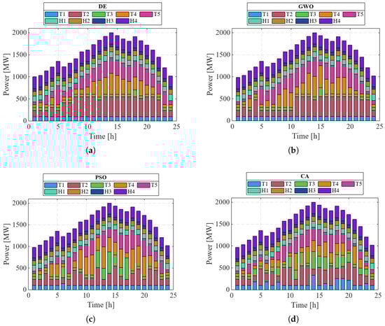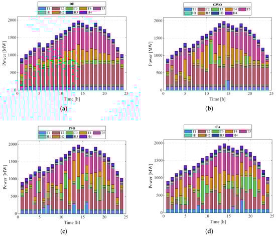 Energy contribution of each unit proposed by the optimization techniques in the second scenario: (a) Differential evolution. (b) Grey wolf optimization. (c) Particle swarm optimization. (d) Cultural algorithm.