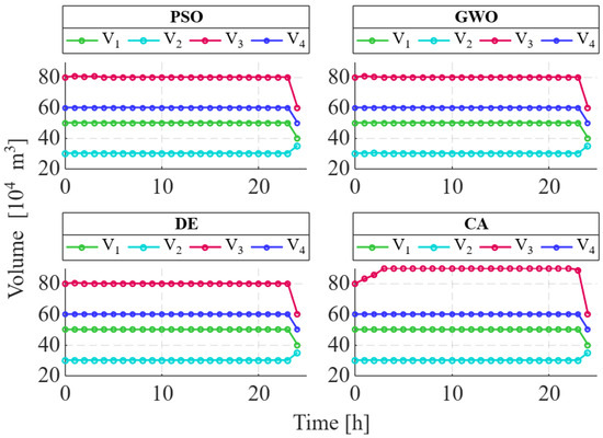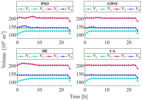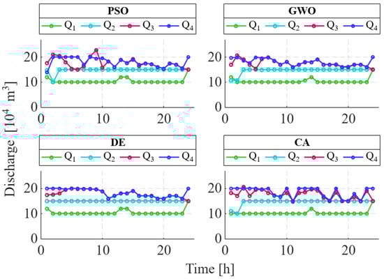 For each scenario, only two independent runs were performed per algorithm, which limits the feasibility of applying formal statistical significance tests. Nevertheless, the Differential Evolution (DE) algorithm consistently yielded the lowest operating costs across both hydropower availability scenarios, with negligible variation between repetitions (less than 0.5%). In comparison, Particle Swarm Optimization (PSO) and the Cultural Algorithm (CA) exhibited higher variability, reaching differences of up to 2.3%. These observations, combined with DE’s consistently superior average performance, highlight its practical advantage in cost minimization, even in the absence of formal statistical validation.