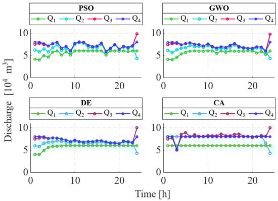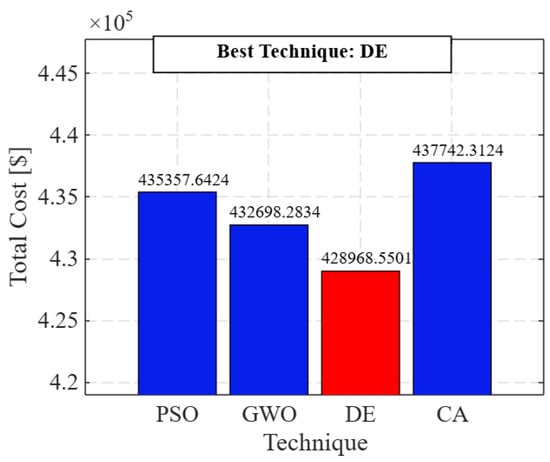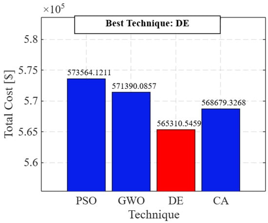 In Scenario 2 (Table 13), with increased hydroelectric contribution, the DE algorithm once again achieved the best performance in terms of cost minimization, with a best cost of USD 5.6531 . Similar to the first scenario, DE required significantly more computational time (84.08 s average), but its convergence remained stable and repeatable. PSO was again the fastest method (12.29 s average) but showed the largest gap between best and worst costs, indicating higher sensitivity to initial conditions. CA exhibited the longest execution time overall (156.05 s), and GWO offered a balanced compromise between cost and runtime. These results reinforce the consistency and optimization capacity of DE under varying operational conditions.