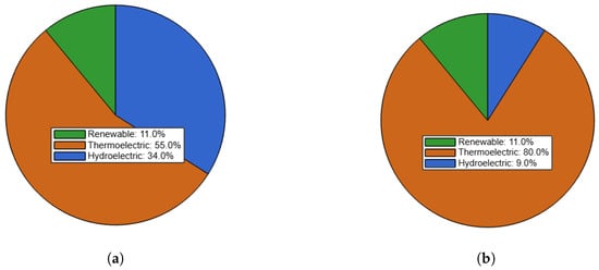 Finally, in Figure 16, the results are presented as percentages of the contribution of each type of generation in both scenarios. As mentioned earlier, renewable sources will remain constant to observe the consequences of periods with high and low water availability for hydroelectric plants.