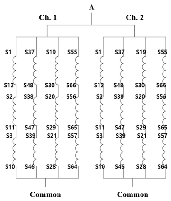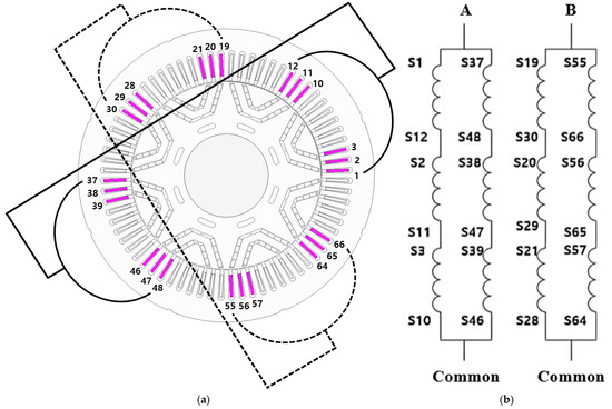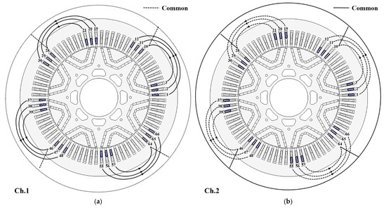 The analysis target is an eight-pole, 72-slot IPMSM, as shown in Figure 1, with 3 equivalent slots per pole. Table 1 presents the specifications of the analysis model. The maximum torque is 1200 Nm, and the operating speed ranges from a base speed of 1500 rpm to a maximum speed of 5000 rpm. The maximum output power is 190 kW. The stator winding is a concentric winding with eight parallel circuits, and the maximum applied current is 750 Arms. Figure 2 shows the initial winding configuration of the analysis model, where (a) represents the winding diagram for Ch.1, and (b) represents the winding diagram for Ch.2. Figure 3 illustrates the initial planar winding diagram of the analysis model. It shows that a parallel circuit is fastened to one inverter through one terminal.