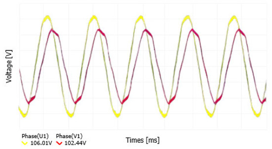The dynamometer test results of the initial analysis model presented in Figure 4 show voltage imbalance caused by inter-channel asymmetry. U1 is 106.01 V, and V1 is 102.44 V, resulting in a phase-to-phase voltage difference of 3.57 V. The unit is RMS phase voltage. The conditions that caused this imbalance were analyzed using a two-dimensional finite element method (FEM). To investigate the assumption of a phase difference between channel currents, a current phase difference condition was applied. The analysis confirmed that applying a current phase difference condition resulted in the same voltage imbalance as observed in the dynamometer experiment. When an inter-channel imbalance occurs, it leads to an uneven power distribution between the channel inverters. If excessive current flows through a specific part of the motor, it can result in overheating due to increased copper losses, ultimately causing insulation breakdown and damage to the motor. Furthermore, the occurrence of inter-channel imbalance can degrade inverter control performance, leading to instability in speed and torque control, which negatively affects the motor’s operational stability and performance. Therefore, compensating for inter-channel imbalance is essential to ensure stable motor operation and precise control [5,6].