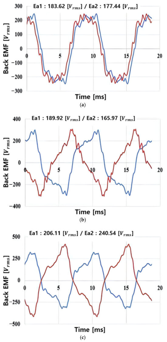 To identify the cause of the phase imbalance, the back electromotive force (EMF) was analyzed for three different cases of phase angle differences, as shown in Figure 5. It was confirmed that a phase voltage imbalance occurs when there is a phase difference, and the larger the phase difference, the greater the phase-to-phase voltage difference. Even though the windings are coiled, if a difference in no-load back EMF between phases occurs, it can lead to an imbalance in the currents flowing between phases under load, which may result in a torque imbalance.