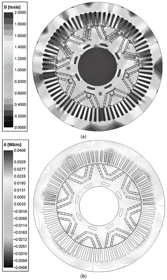 Figure 9a,b show the flux density distribution and flux lines, respectively, at the maximum load operating point of the motor. The inverter control process remains the same as before the channel failure, with power supplied to only the remaining operational inverter. When power is supplied to only one inverter due to failure, it is equivalent to having no current flowing through half of the windings. In this case, flux is generated only in the windings carrying current, resulting in an asymmetric flux distribution within the motor. This imbalance disrupts the magnetic flux path between the rotor and stator, leading to an uneven torque generation in the motor. Consequently, the rotor’s rotation becomes unstable, and the overall performance of the motor deteriorates. Furthermore, the unbalanced flux can introduce adverse effects such as increased motor vibration and noise, potentially leading to further operational issues. As shown in Table 2, torque decreases and torque ripple increases under the fault condition.