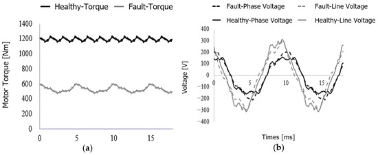 Comparison of operating characteristics in healthy and fault conditions: (a) torque, (b) voltage.