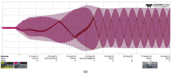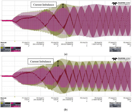 To improve current imbalance, an enhanced stator winding design was implemented. However, a phase difference may still occur due to variations in current offset values during inverter control, leading to inter-channel imbalance. In the twin inverter system, the control command that was previously applied to a single inverter must now be distributed between two inverters, making the system highly sensitive to the selected offset values of each inverter. Figure 11 shows the current waveforms for each channel under different current offset conditions: (a) with an offset of 0, (b) with an offset of −0.015, and (c) with an offset of +0.03. By analyzing the current waveforms applied to each channel under these offset conditions, it was confirmed that the green region—where the waveforms of the channel currents do not match—was the smallest when the offset value was +0.03.