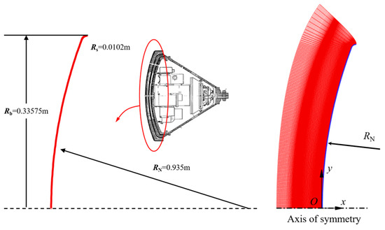 where t is the time; xi is the ordinate variable in the i-th direction; ui is the velocity in the i-th direction; Ns is the total number of air species; Js,j is the mass diffusion flux of species s in the j-th direction; ρs, ωs, hs, and eve,s denote the density, mass production rate per unit volume, enthalpy, and vibrational–electronic energy of species s; ρ, p, and τij represent the total density, pressure, and viscous stress tensor; e, h, and eve are the total energy, total enthalpy, and vibrational–electronic energy; qj and qve,j are the total heat flux and vibrational–electronic heat flux; and ωve is the vibrational–electronic energy source term. The formulas for the mass production source term ωs and the vibrational–electronic energy source term ωve can be seen in the literature by Hao et al. [42] for further details. Park’s two-temperature model is employed to describe the coupling effects of vibration excitation and dissociation.