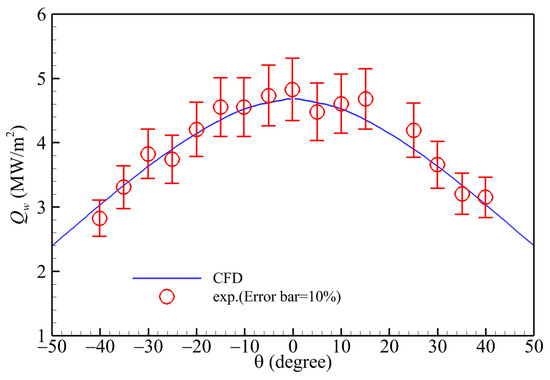 A typical FIRE II flight case [51] and the HEG high-enthalpy shock tunnel experiment [52] are selected to validate the reliability of the PHAROS solver in predicting aerodynamic heating in hypersonic thermochemical nonequilibrium flow. The geometry and mesh of FIRE II are depicted in Figure 1. The freestream parameters of this case are u∞ = 11.3 km/s, ρ∞ = 8.57 × 10−5 kg/m3, T∞ = 210 K, and Ma = 38.9, with the freestream air composed of N2 and O2 having mass fractions of YN2 = 0.77 and YO2 = 0.23, respectively. The FIRE II wall is configured to be non-catalytic, with a temperature of Tw = 810 K. Figure 2 illustrates the wall heat flux distribution predicted by PHAROS, comparing it with results calculated by DPLR and LAURA [51]. The agreement among the three curves demonstrates the reliability of PHAROS. The HEG test conditions included a total enthalpy of 13.4 MJ/kg, p∞ = 687 Pa, u∞ = 4.776 km/s, ρ∞ = 0.00326 kg/m3, T∞ = 694 K, and Ma = 8.78. The freestream air composition by mass fraction was YN2 = 0.73555, YO2 = 0.134, YNO = 0.0509, YN = 0, and YO = 0.07955. Figure 3 presents a comparison between the predicted surface heat flux by the PHAROS solver and the experiment data. A 10% error margin is indicated, and all CFD predictions lie within this range, indicating strong consistency with the experimental measurements.